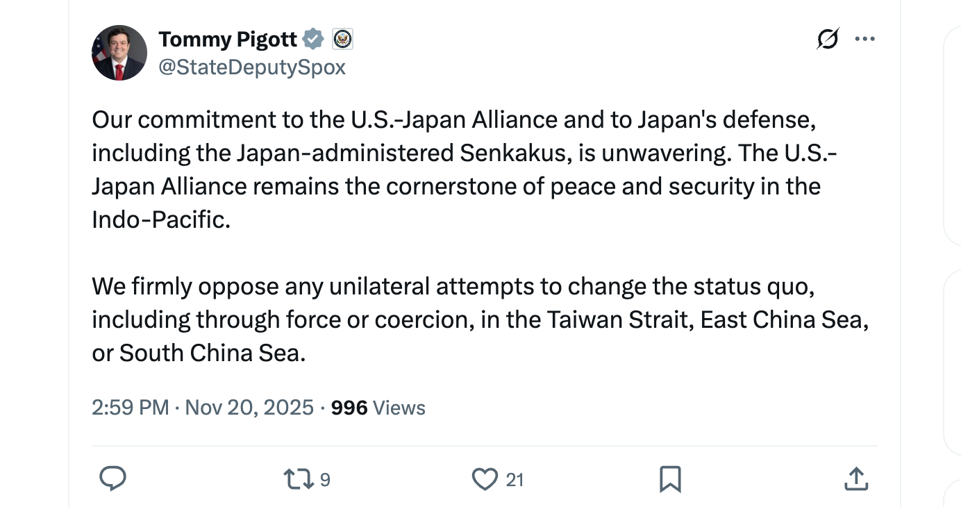 1. Japan-China - There is no apparent progress towards a resolution of the current Japan-China crisis, so everyone may need to settle in for a long period of heightened tensions. No new countermeasures were announced Thursday, while the Ministry of Foreign Affairs spokesperson again demanded the Japanese Prime Minister “retract the erroneous remarks”, which is not going to happen. The US State Department finally posted a statement of support for Japan on X: