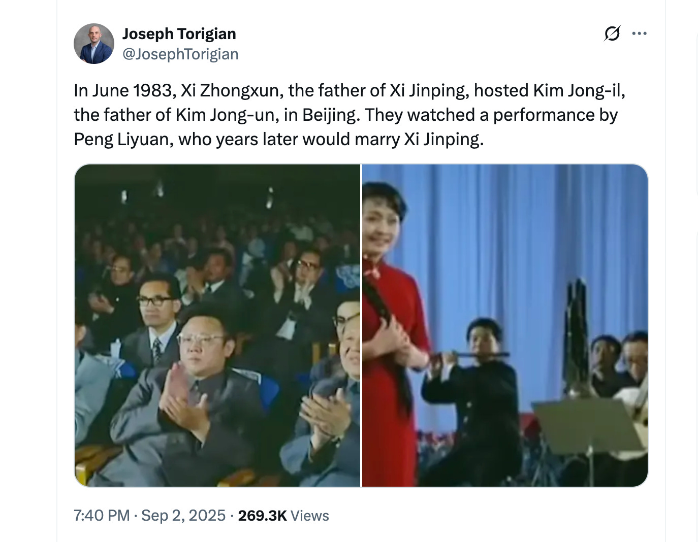 You can follow Professor Torigian on X. The tweet he mentioned about Kim Jong-il, Xi Zhongxun and Peng Liyuan: