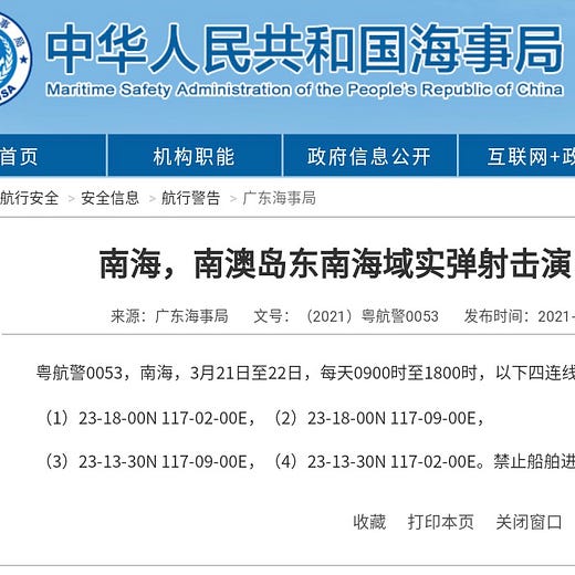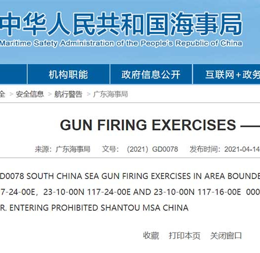The six-day exercise will be carried out to the south of the Penghu archipelago in the Taiwan Strait, the Guangdong Maritime Safety Administration announced on Wednesday.