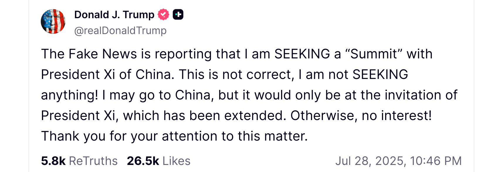 Earlier Tuesday President Trump in a post to Truth Social expressed his frustration at recent media reports that he has softened on China: