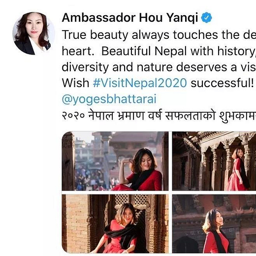 Ambassador Hou Yanqi is quite active on Twitter @PRCAmbNepal. Here she is previously trying to charm Nepalese: