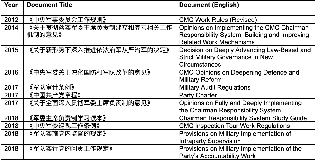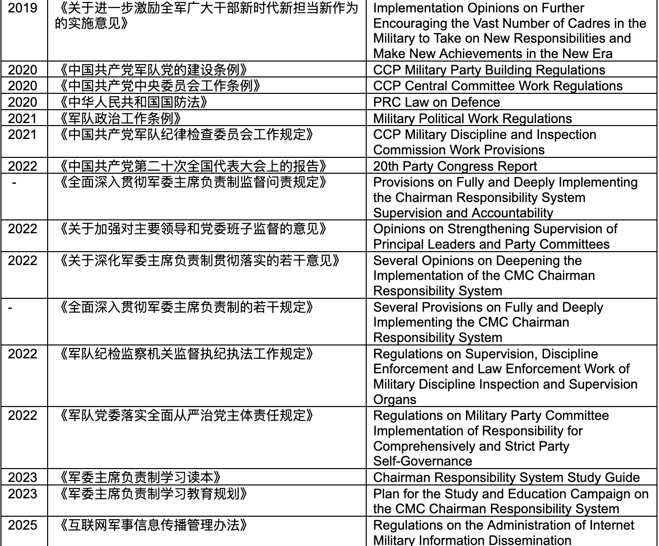The Party has both “military Party regulations” (军队党内法规) and “Party military regulations” (军事党内法规), formulated by the CMC and the Party respectively, see Zhu Daokun 朱道坤, 2021, 军事党内法规体系初探 [Preliminary Thoughts on the System of Military-related Intra-party Regulaions], 《党内法规理论研究》Intraparty Regulatory Theory Studies. The table below includes both.