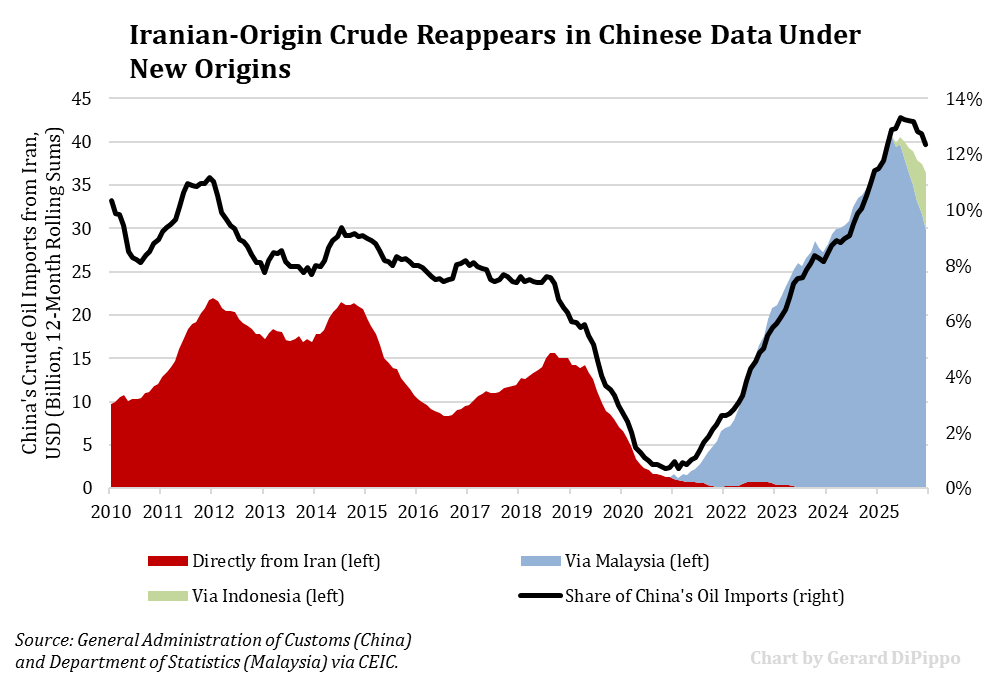 This chart from Gerard DiPippo shows that Iranian oil makes up about 12% of the PRC’s total oil imports: